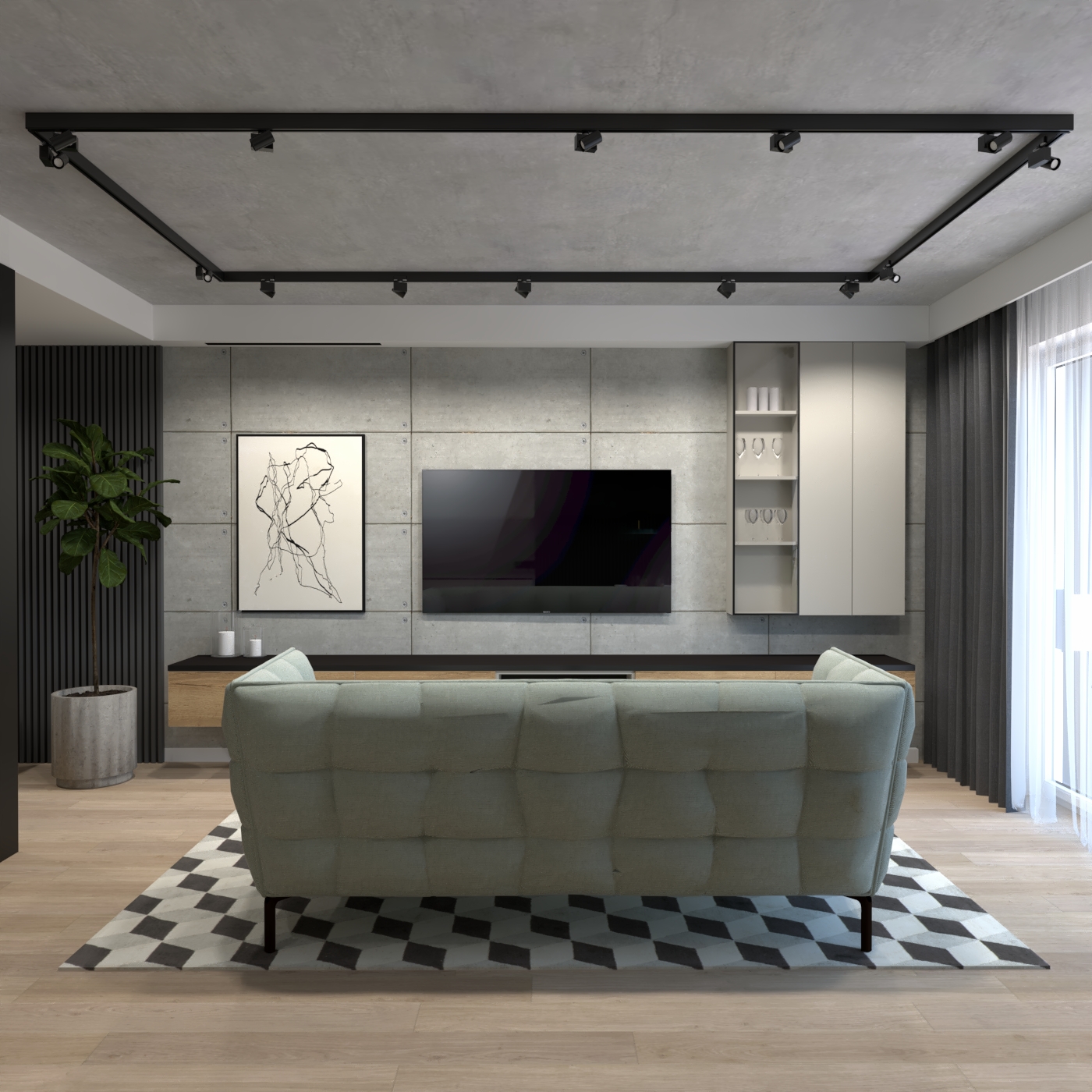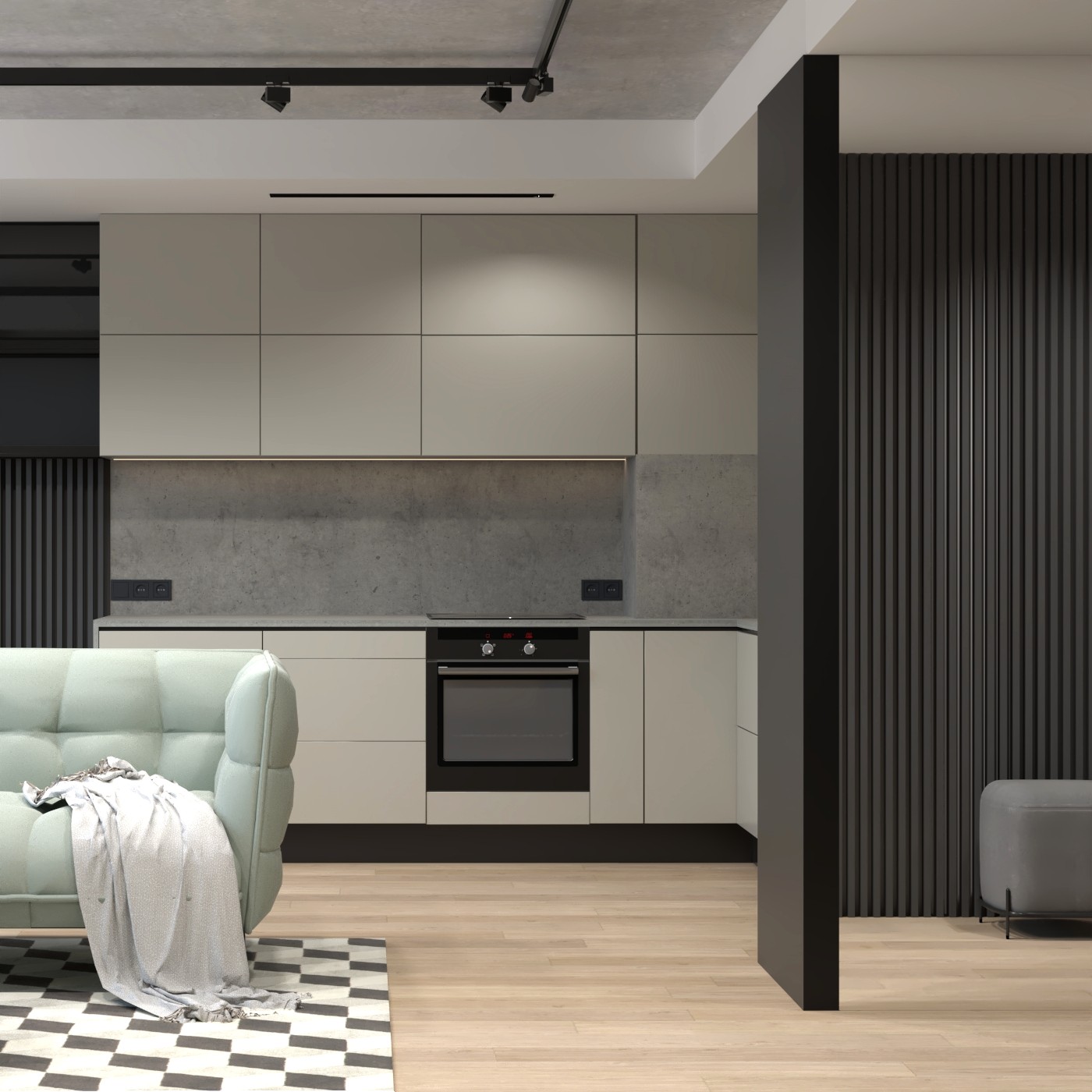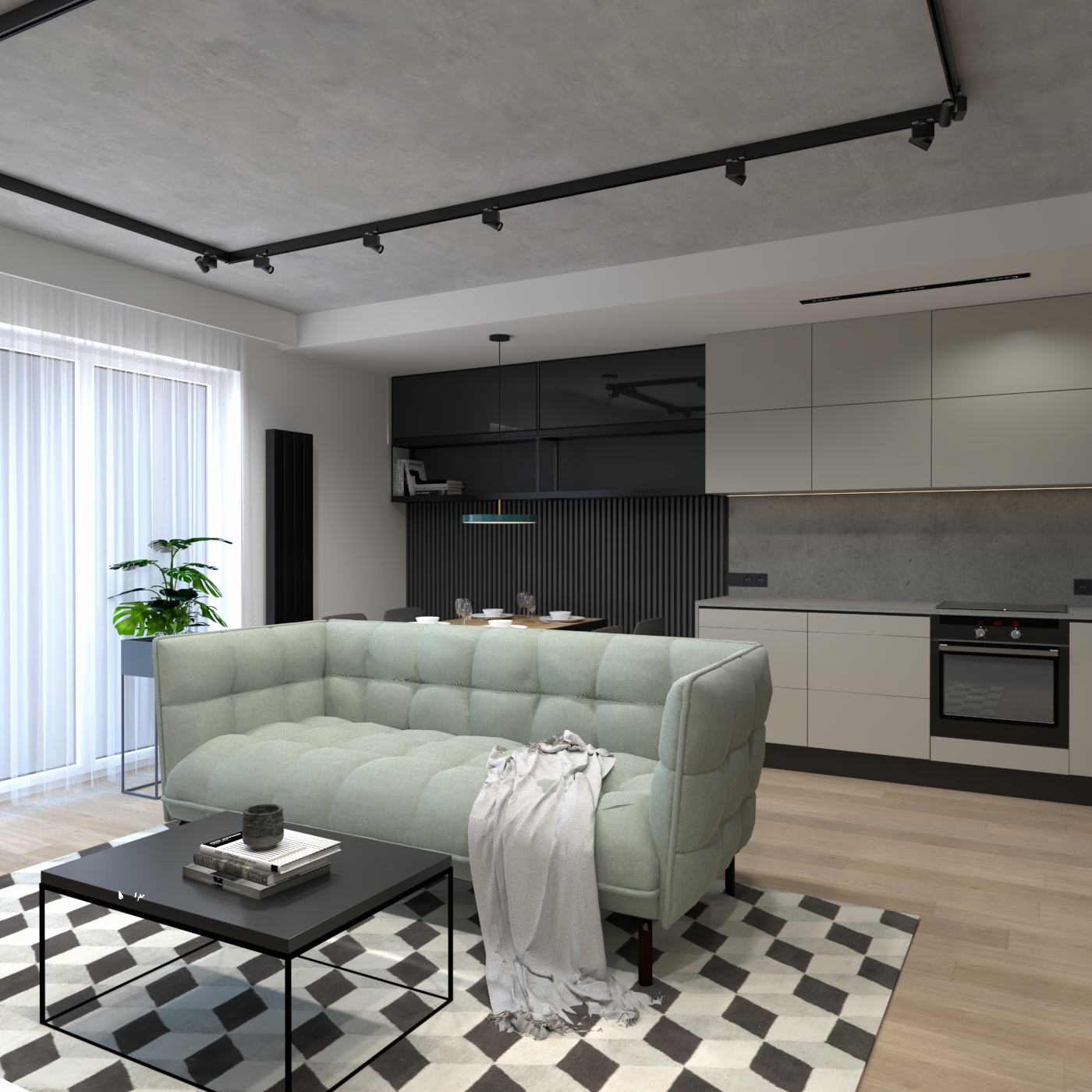 Salon z aneksem kuchennym w mieszkaniu 54 mkw
